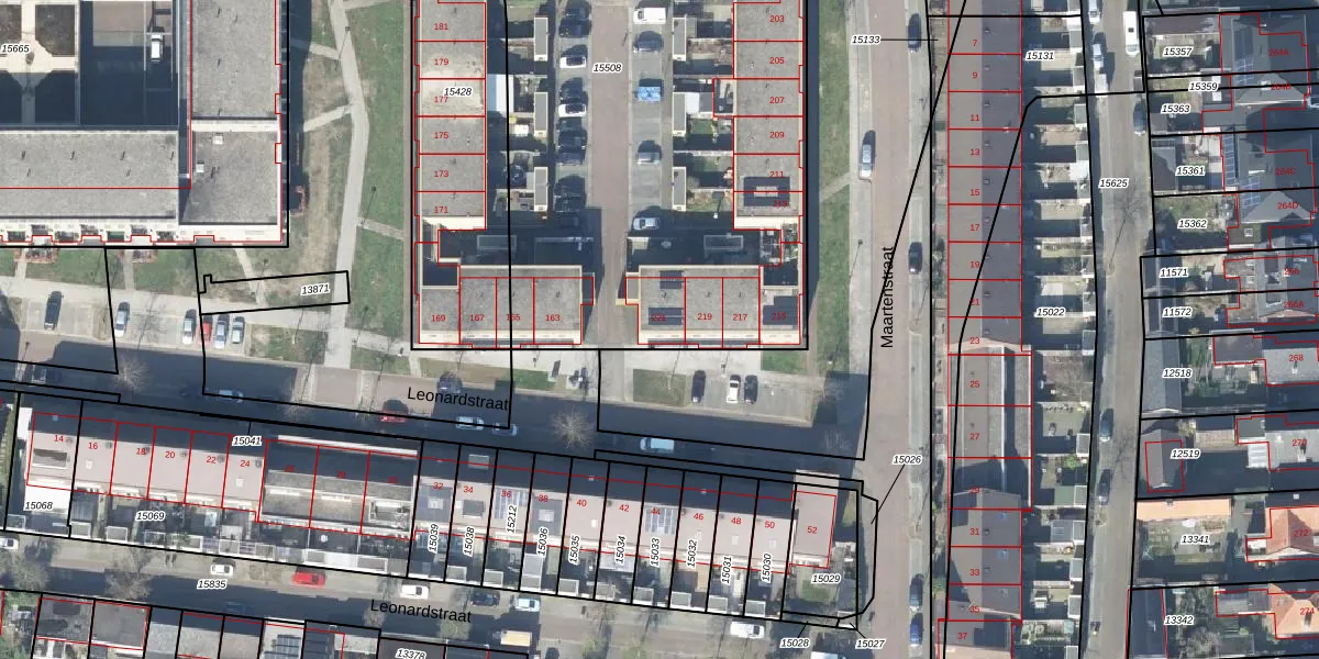 Het perceel waarop Leonardstraat 221 staat heeft een oppervlakte van 2667 m². Dit is een zeer groot perceel. De perceeloppervlakte wordt geregistreerd door het Kadaster. Gedetailleerde informatie over de maten van dit perceel kunt u vinden in het rapport Kadastrale kaart met maatvoering van Leonardstraat 221.