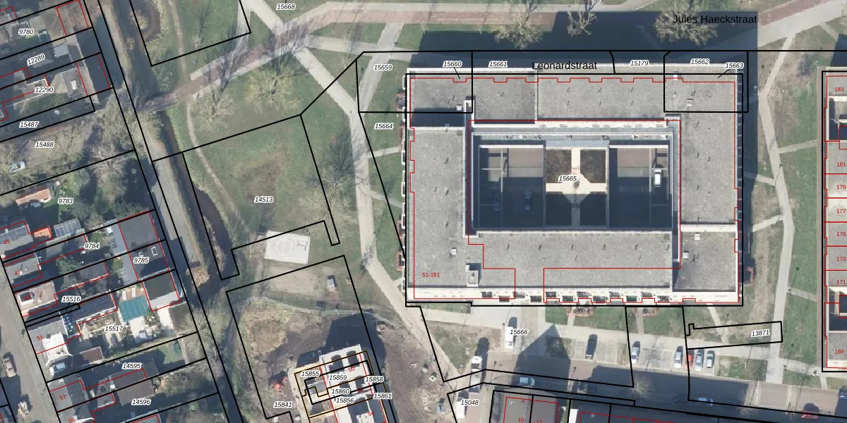 Het perceel waarop Leonardstraat 53 staat heeft een oppervlakte van 4035 m². Dit is een zeer groot perceel. De perceeloppervlakte wordt geregistreerd door het Kadaster. Gedetailleerde informatie over de maten van dit perceel kunt u vinden in het rapport Kadastrale kaart met maatvoering van Leonardstraat 53.
