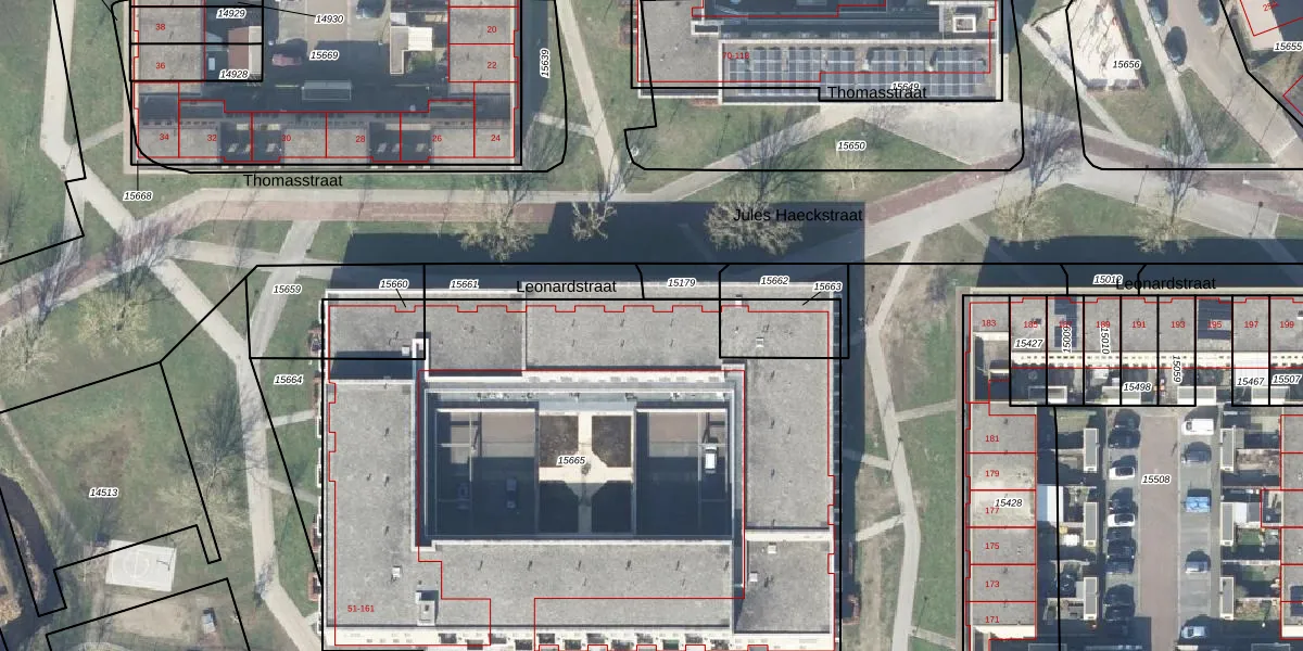 Het perceel waarop Leonardstraat 67 staat heeft een oppervlakte van 4035 m². Dit is een zeer groot perceel. De perceeloppervlakte wordt geregistreerd door het Kadaster. Gedetailleerde informatie over de maten van dit perceel kunt u vinden in het rapport Kadastrale kaart met maatvoering van Leonardstraat 67.