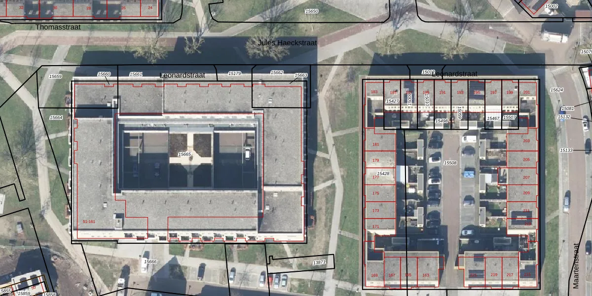 Het perceel waarop Leonardstraat 73 staat heeft een oppervlakte van 4035 m². Dit is een zeer groot perceel. De perceeloppervlakte wordt geregistreerd door het Kadaster. Gedetailleerde informatie over de maten van dit perceel kunt u vinden in het rapport Kadastrale kaart met maatvoering van Leonardstraat 73.