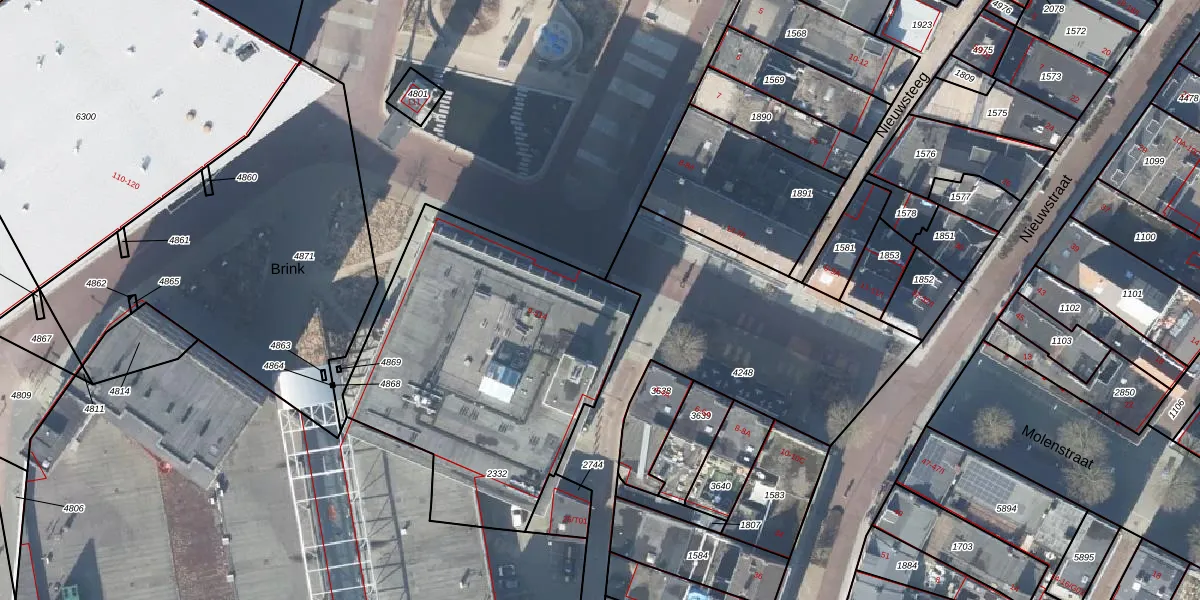 Het perceel waarop Markt 102 staat heeft een oppervlakte van 1585 m². Dit is een zeer groot perceel. De perceeloppervlakte wordt geregistreerd door het Kadaster. Gedetailleerde informatie over de maten van dit perceel kunt u vinden in het rapport Kadastrale kaart met maatvoering van Markt 102.