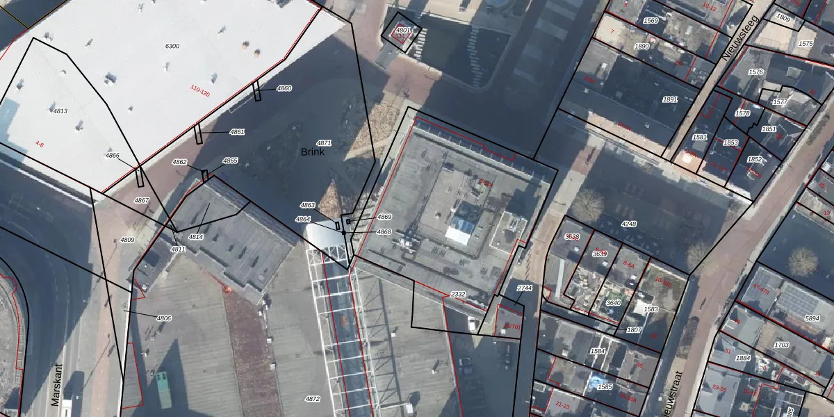 Het perceel waarop Markt 112 staat heeft een oppervlakte van 1585 m². Dit is een zeer groot perceel. De perceeloppervlakte wordt geregistreerd door het Kadaster. Gedetailleerde informatie over de maten van dit perceel kunt u vinden in het rapport Kadastrale kaart met maatvoering van Markt 112.