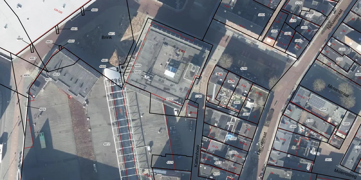 Het perceel waarop Markt 514 staat heeft een oppervlakte van 1585 m². Dit is een zeer groot perceel. De perceeloppervlakte wordt geregistreerd door het Kadaster. Gedetailleerde informatie over de maten van dit perceel kunt u vinden in het rapport Kadastrale kaart met maatvoering van Markt 514.