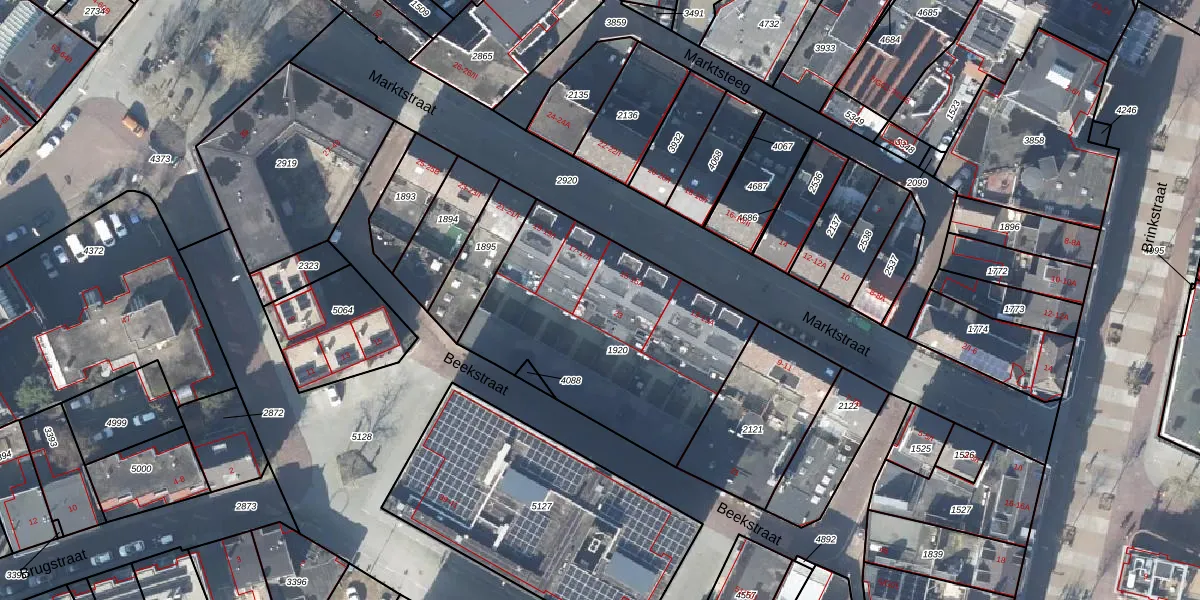 Het perceel waarop Marktstraat 15-E staat heeft een oppervlakte van 1150 m². Dit is een zeer groot perceel. De perceeloppervlakte wordt geregistreerd door het Kadaster. Gedetailleerde informatie over de maten van dit perceel kunt u vinden in het rapport Kadastrale kaart met maatvoering van Marktstraat 15-E.