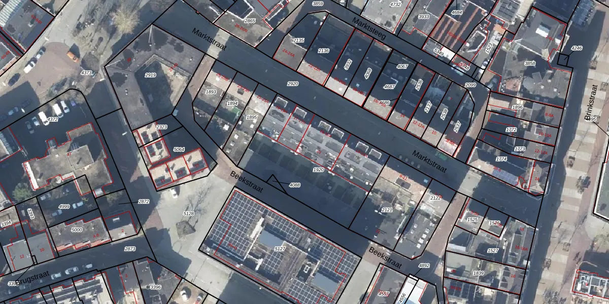 Het perceel waarop Marktstraat 15-G staat heeft een oppervlakte van 1150 m². Dit is een zeer groot perceel. De perceeloppervlakte wordt geregistreerd door het Kadaster. Gedetailleerde informatie over de maten van dit perceel kunt u vinden in het rapport Kadastrale kaart met maatvoering van Marktstraat 15-G.