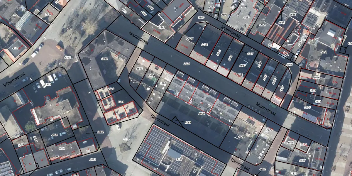 Het perceel waarop Marktstraat 19-B staat heeft een oppervlakte van 1150 m². Dit is een zeer groot perceel. De perceeloppervlakte wordt geregistreerd door het Kadaster. Gedetailleerde informatie over de maten van dit perceel kunt u vinden in het rapport Kadastrale kaart met maatvoering van Marktstraat 19-B.