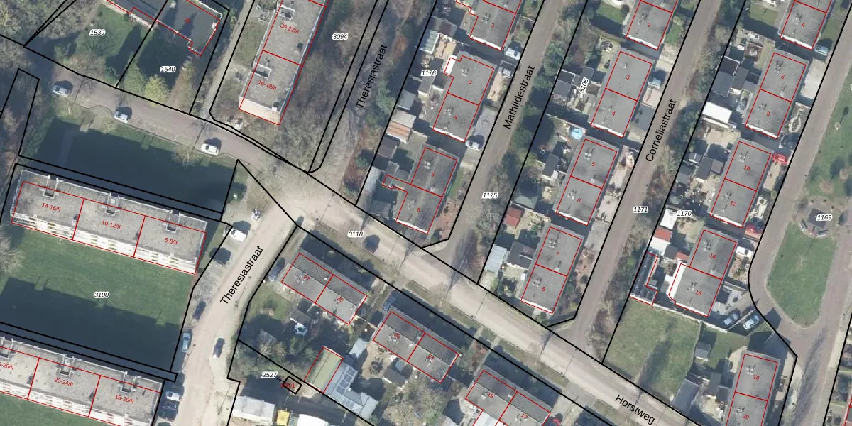 Het perceel waarop Mathildestraat 6 staat heeft een oppervlakte van 1630 m². Dit is een zeer groot perceel. De perceeloppervlakte wordt geregistreerd door het Kadaster. Gedetailleerde informatie over de maten van dit perceel kunt u vinden in het rapport Kadastrale kaart met maatvoering van Mathildestraat 6.
