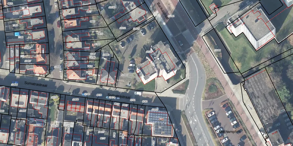 Het perceel waarop Mitchamplein 17 staat heeft een oppervlakte van 1715 m². Dit is een zeer groot perceel. De perceeloppervlakte wordt geregistreerd door het Kadaster. Gedetailleerde informatie over de maten van dit perceel kunt u vinden in het rapport Kadastrale kaart met maatvoering van Mitchamplein 17.