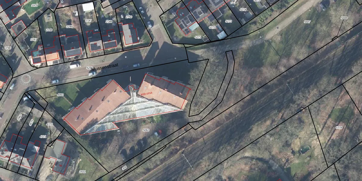 Mussenstraat 6-10 is gelegen op kadastraal perceel HGL01O5062. Deze kadastrale aanduiding is uniek en wordt gebruikt door het Kadaster om eigendomsrechten en andere zakelijke rechten vast te leggen. Het perceel maakt onderdeel uit van de kadastrale gemeente Hengelo Overijssel.