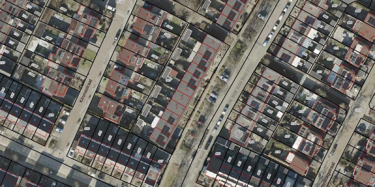Het perceel waarop Oslostraat 13 staat heeft een oppervlakte van 1638 m². Dit is een zeer groot perceel. De perceeloppervlakte wordt geregistreerd door het Kadaster. Gedetailleerde informatie over de maten van dit perceel kunt u vinden in het rapport Kadastrale kaart met maatvoering van Oslostraat 13.