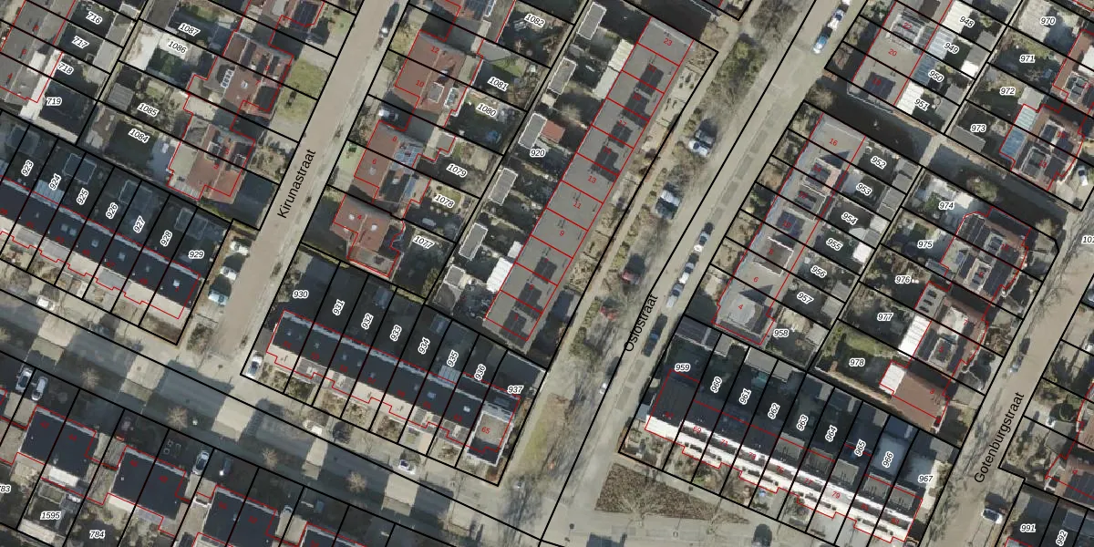 Het perceel waarop Oslostraat 7 staat heeft een oppervlakte van 1638 m². Dit is een zeer groot perceel. De perceeloppervlakte wordt geregistreerd door het Kadaster. Gedetailleerde informatie over de maten van dit perceel kunt u vinden in het rapport Kadastrale kaart met maatvoering van Oslostraat 7.