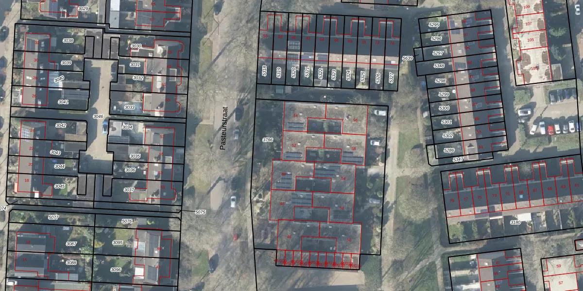 Het perceel waarop Pasteurstraat 52 staat heeft een oppervlakte van 2475 m². Dit is een zeer groot perceel. De perceeloppervlakte wordt geregistreerd door het Kadaster. Gedetailleerde informatie over de maten van dit perceel kunt u vinden in het rapport Kadastrale kaart met maatvoering van Pasteurstraat 52.