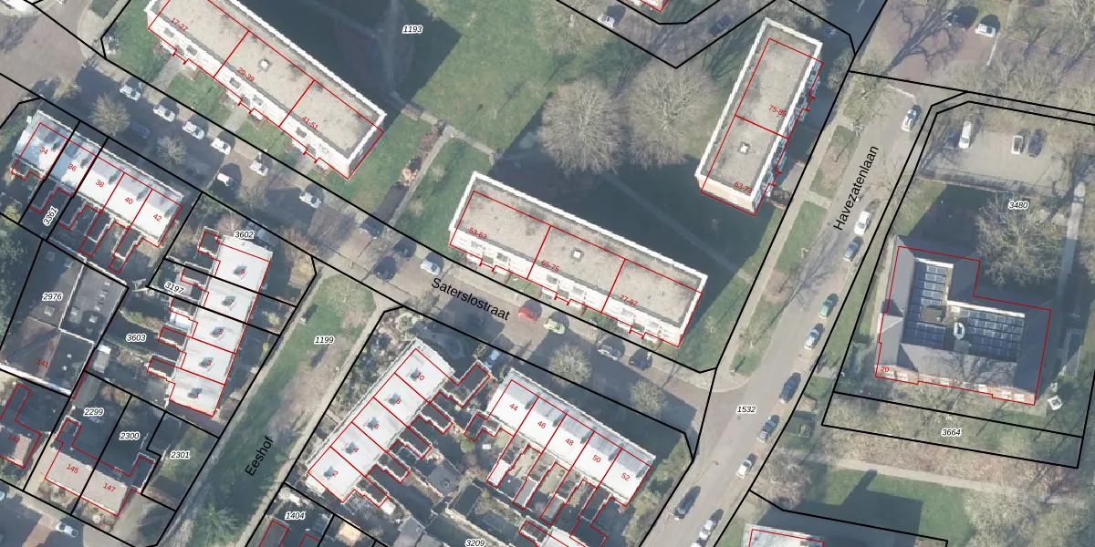 Het perceel waarop Saterslostraat 65 staat heeft een oppervlakte van 7080 m². Dit is een zeer groot perceel. De perceeloppervlakte wordt geregistreerd door het Kadaster. Gedetailleerde informatie over de maten van dit perceel kunt u vinden in het rapport Kadastrale kaart met maatvoering van Saterslostraat 65.