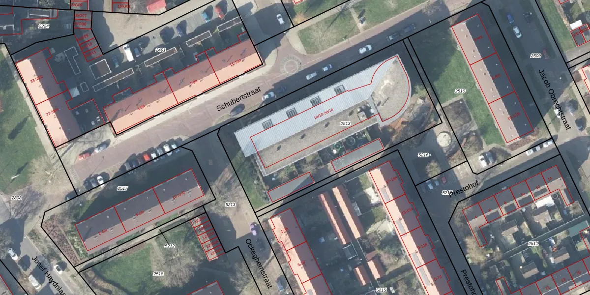 Het perceel waarop Schubertstraat 26-14 staat heeft een oppervlakte van 2190 m². Dit is een zeer groot perceel. De perceeloppervlakte wordt geregistreerd door het Kadaster. Gedetailleerde informatie over de maten van dit perceel kunt u vinden in het rapport Kadastrale kaart met maatvoering van Schubertstraat 26-14.