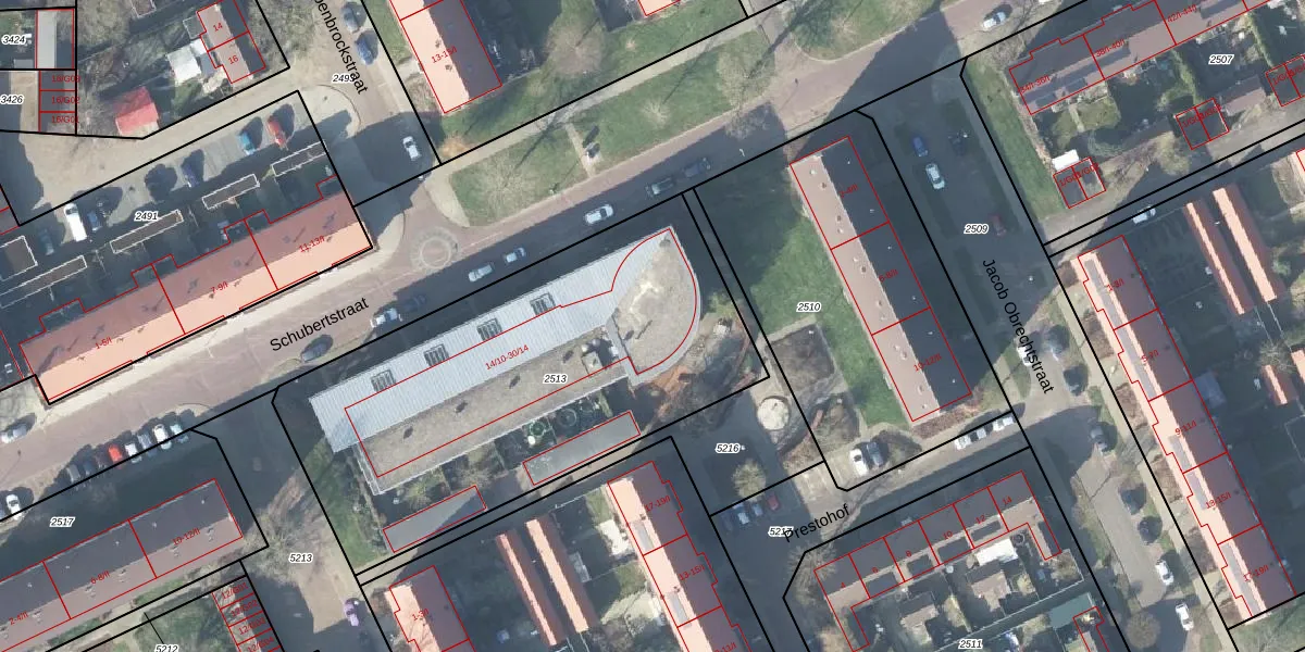 Het perceel waarop Schubertstraat 30-14 staat heeft een oppervlakte van 2190 m². Dit is een zeer groot perceel. De perceeloppervlakte wordt geregistreerd door het Kadaster. Gedetailleerde informatie over de maten van dit perceel kunt u vinden in het rapport Kadastrale kaart met maatvoering van Schubertstraat 30-14.