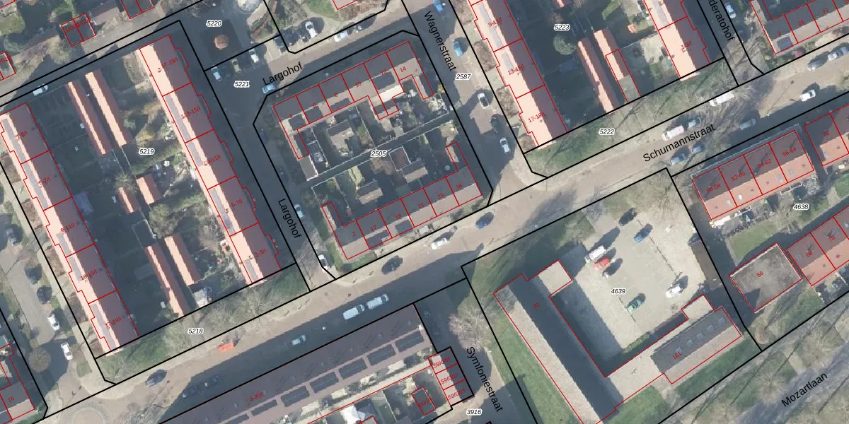 Het perceel waarop Schumannstraat 21 staat heeft een oppervlakte van 2020 m². Dit is een zeer groot perceel. De perceeloppervlakte wordt geregistreerd door het Kadaster. Gedetailleerde informatie over de maten van dit perceel kunt u vinden in het rapport Kadastrale kaart met maatvoering van Schumannstraat 21.
