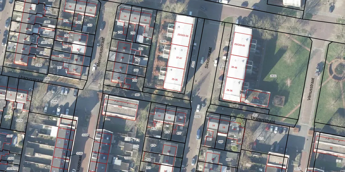 Het perceel waarop Siriusstraat 25 staat heeft een oppervlakte van 1095 m². Dit is een zeer groot perceel. De perceeloppervlakte wordt geregistreerd door het Kadaster. Gedetailleerde informatie over de maten van dit perceel kunt u vinden in het rapport Kadastrale kaart met maatvoering van Siriusstraat 25.
