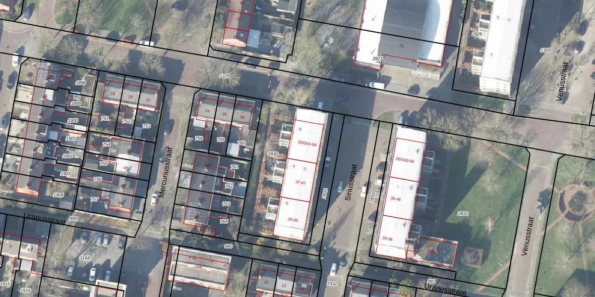 Het perceel waarop Siriusstraat 57 staat heeft een oppervlakte van 1095 m². Dit is een zeer groot perceel. De perceeloppervlakte wordt geregistreerd door het Kadaster. Gedetailleerde informatie over de maten van dit perceel kunt u vinden in het rapport Kadastrale kaart met maatvoering van Siriusstraat 57.