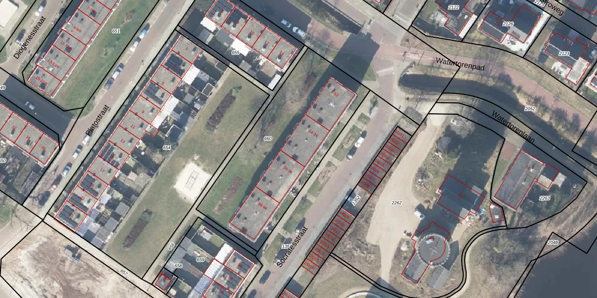 Het perceel waarop Socratesstraat 20 staat heeft een oppervlakte van 1652 m². Dit is een zeer groot perceel. De perceeloppervlakte wordt geregistreerd door het Kadaster. Gedetailleerde informatie over de maten van dit perceel kunt u vinden in het rapport Kadastrale kaart met maatvoering van Socratesstraat 20.