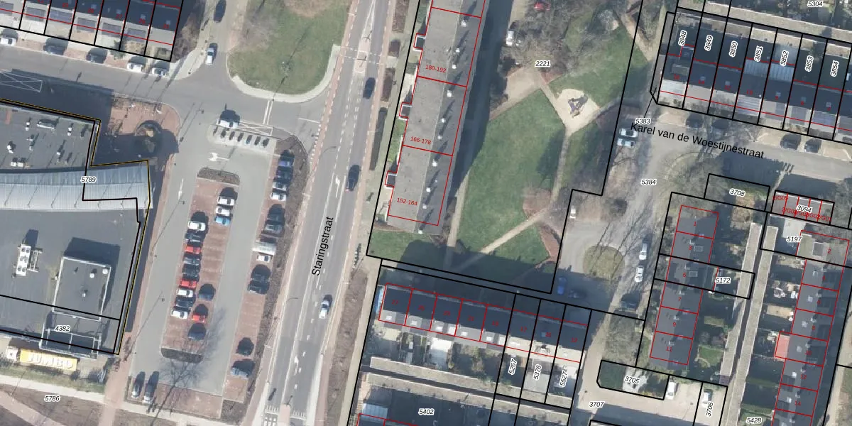 Het perceel waarop Staringstraat 158 staat heeft een oppervlakte van 4545 m². Dit is een zeer groot perceel. De perceeloppervlakte wordt geregistreerd door het Kadaster. Gedetailleerde informatie over de maten van dit perceel kunt u vinden in het rapport Kadastrale kaart met maatvoering van Staringstraat 158.
