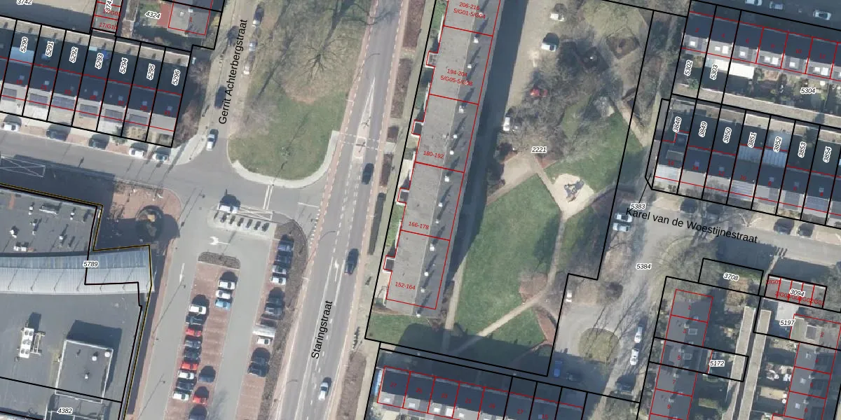 Het perceel waarop Staringstraat 168 staat heeft een oppervlakte van 4545 m². Dit is een zeer groot perceel. De perceeloppervlakte wordt geregistreerd door het Kadaster. Gedetailleerde informatie over de maten van dit perceel kunt u vinden in het rapport Kadastrale kaart met maatvoering van Staringstraat 168.