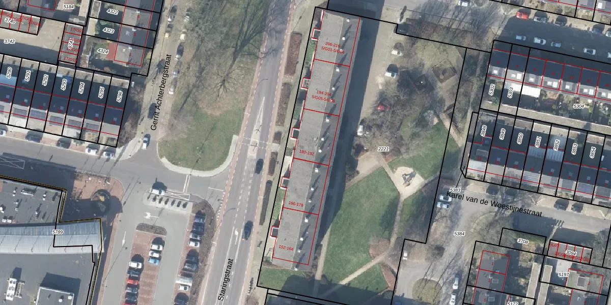 Het perceel waarop Staringstraat 180 staat heeft een oppervlakte van 4545 m². Dit is een zeer groot perceel. De perceeloppervlakte wordt geregistreerd door het Kadaster. Gedetailleerde informatie over de maten van dit perceel kunt u vinden in het rapport Kadastrale kaart met maatvoering van Staringstraat 180.