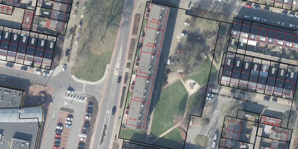 Het perceel waarop Staringstraat 186 staat heeft een oppervlakte van 4545 m². Dit is een zeer groot perceel. De perceeloppervlakte wordt geregistreerd door het Kadaster. Gedetailleerde informatie over de maten van dit perceel kunt u vinden in het rapport Kadastrale kaart met maatvoering van Staringstraat 186.