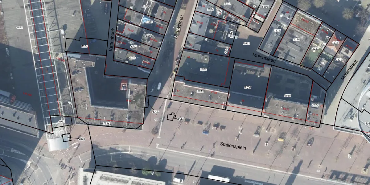 Het perceel waarop Stationsplein 49 staat heeft een oppervlakte van 363 m². Dit is een groot perceel. De perceeloppervlakte wordt geregistreerd door het Kadaster. Gedetailleerde informatie over de maten van dit perceel kunt u vinden in het rapport Kadastrale kaart met maatvoering van Stationsplein 49.