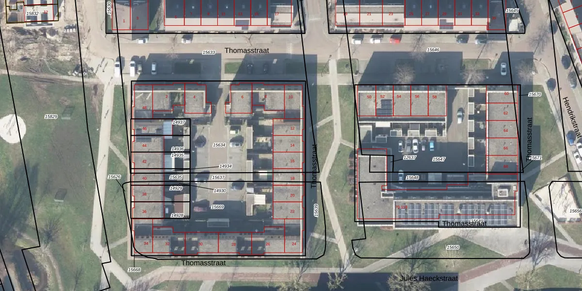 Thomasstraat 14 is gelegen op kadastraal perceel HGL01D15634. Deze kadastrale aanduiding is uniek en wordt gebruikt door het Kadaster om eigendomsrechten en andere zakelijke rechten vast te leggen. Het perceel maakt onderdeel uit van de kadastrale gemeente Hengelo Overijssel.