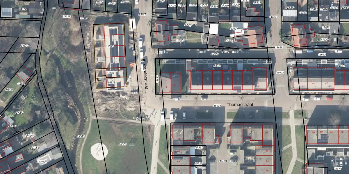 Het perceel waarop Thomasstraat 3 staat heeft een oppervlakte van 1290 m². Dit is een zeer groot perceel. De perceeloppervlakte wordt geregistreerd door het Kadaster. Gedetailleerde informatie over de maten van dit perceel kunt u vinden in het rapport Kadastrale kaart met maatvoering van Thomasstraat 3.