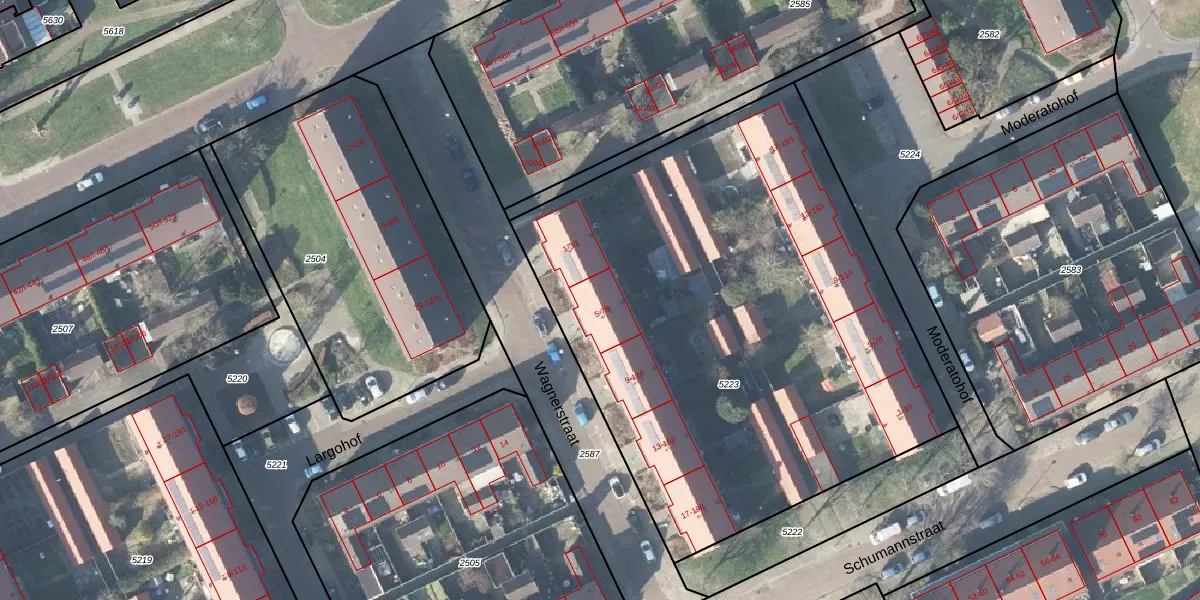 Het perceel waarop Wagnerstraat 5-I staat heeft een oppervlakte van 3349 m². Dit is een zeer groot perceel. De perceeloppervlakte wordt geregistreerd door het Kadaster. Gedetailleerde informatie over de maten van dit perceel kunt u vinden in het rapport Kadastrale kaart met maatvoering van Wagnerstraat 5-I.