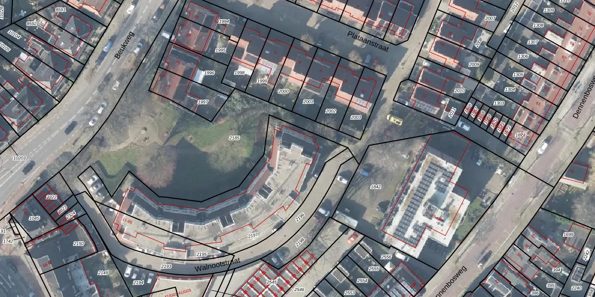 Het perceel waarop Walnootstraat 77 staat heeft een oppervlakte van 1506 m². Dit is een zeer groot perceel. De perceeloppervlakte wordt geregistreerd door het Kadaster. Gedetailleerde informatie over de maten van dit perceel kunt u vinden in het rapport Kadastrale kaart met maatvoering van Walnootstraat 77.