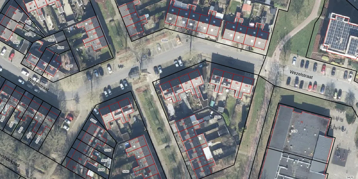 Het perceel waarop Wezelstraat 93 staat heeft een oppervlakte van 2508 m². Dit is een zeer groot perceel. De perceeloppervlakte wordt geregistreerd door het Kadaster. Gedetailleerde informatie over de maten van dit perceel kunt u vinden in het rapport Kadastrale kaart met maatvoering van Wezelstraat 93.