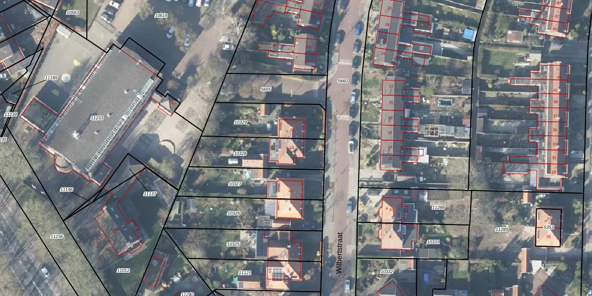 Het perceel waarop Wilbertstraat 13 staat heeft een oppervlakte van 453 m². Dit is een groot perceel. De perceeloppervlakte wordt geregistreerd door het Kadaster. Gedetailleerde informatie over de maten van dit perceel kunt u vinden in het rapport Kadastrale kaart met maatvoering van Wilbertstraat 13.