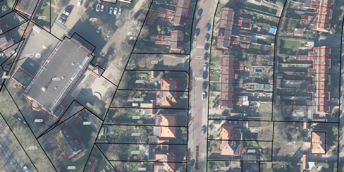 Het perceel waarop Wilbertstraat 15 staat heeft een oppervlakte van 454 m². Dit is een groot perceel. De perceeloppervlakte wordt geregistreerd door het Kadaster. Gedetailleerde informatie over de maten van dit perceel kunt u vinden in het rapport Kadastrale kaart met maatvoering van Wilbertstraat 15.