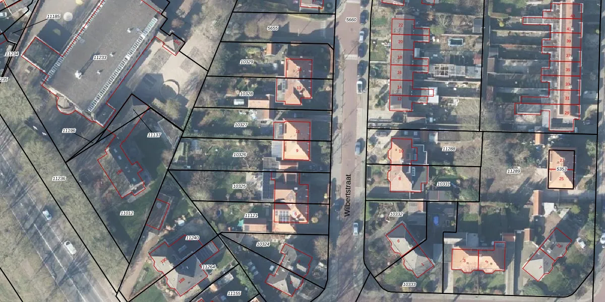 Het perceel waarop Wilbertstraat 9 staat heeft een oppervlakte van 538 m². Dit is een groot perceel. De perceeloppervlakte wordt geregistreerd door het Kadaster. Gedetailleerde informatie over de maten van dit perceel kunt u vinden in het rapport Kadastrale kaart met maatvoering van Wilbertstraat 9.