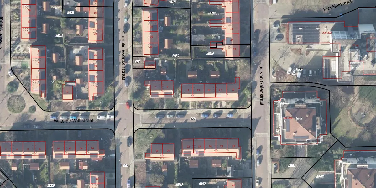 Het perceel waarop Witte de Withstraat 11 staat heeft een oppervlakte van 2453 m². Dit is een zeer groot perceel. De perceeloppervlakte wordt geregistreerd door het Kadaster. Gedetailleerde informatie over de maten van dit perceel kunt u vinden in het rapport Kadastrale kaart met maatvoering van Witte de Withstraat 11.