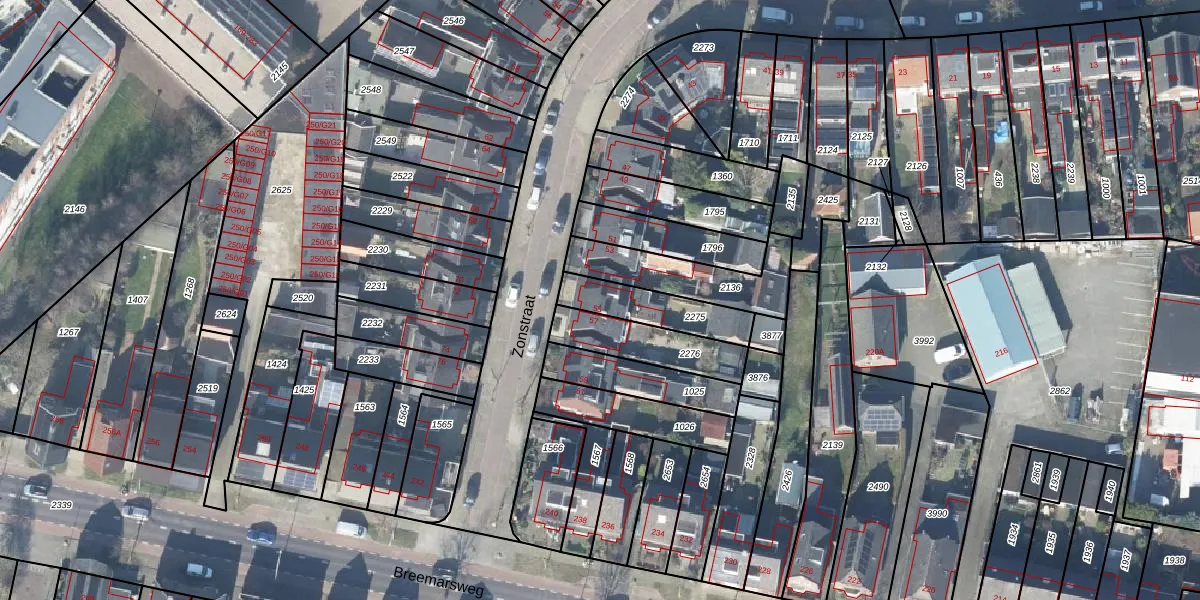 Het perceel waarop Zonstraat 55 staat heeft een oppervlakte van 195 m². Dit is een middelgroot perceel. De perceeloppervlakte wordt geregistreerd door het Kadaster. Gedetailleerde informatie over de maten van dit perceel kunt u vinden in het rapport Kadastrale kaart met maatvoering van Zonstraat 55.