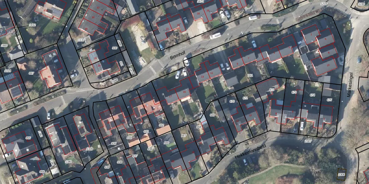 Het perceel waarop Bomhof 15 staat heeft een oppervlakte van 3015 m². Dit is een zeer groot perceel. De perceeloppervlakte wordt geregistreerd door het Kadaster. Gedetailleerde informatie over de maten van dit perceel kunt u vinden in het rapport Kadastrale kaart met maatvoering van Bomhof 15.