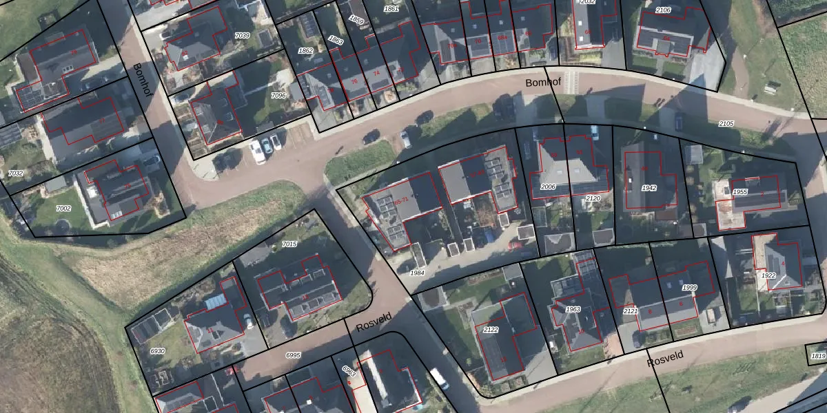 Het perceel waarop Bomhof 67 staat heeft een oppervlakte van 1238 m². Dit is een zeer groot perceel. De perceeloppervlakte wordt geregistreerd door het Kadaster. Gedetailleerde informatie over de maten van dit perceel kunt u vinden in het rapport Kadastrale kaart met maatvoering van Bomhof 67.