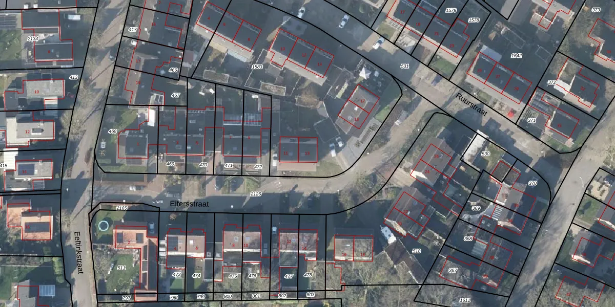 Het perceel waarop Elfersstraat 13 staat heeft een oppervlakte van 2203 m². Dit is een zeer groot perceel. De perceeloppervlakte wordt geregistreerd door het Kadaster. Gedetailleerde informatie over de maten van dit perceel kunt u vinden in het rapport Kadastrale kaart met maatvoering van Elfersstraat 13.