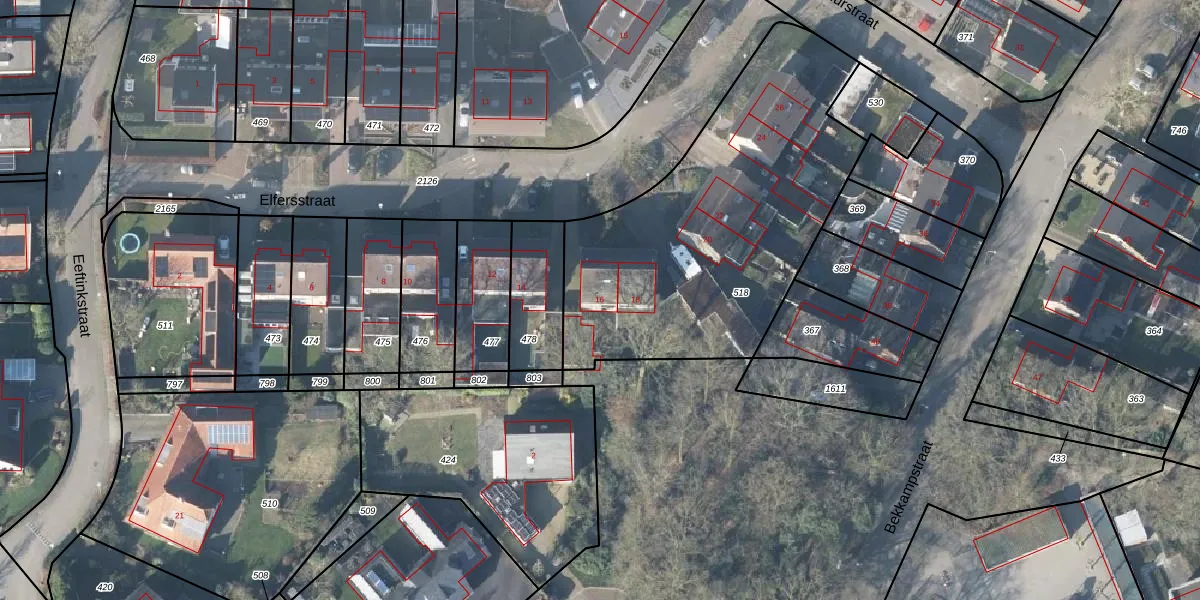 Het perceel waarop Elfersstraat 16 staat heeft een oppervlakte van 1640 m². Dit is een zeer groot perceel. De perceeloppervlakte wordt geregistreerd door het Kadaster. Gedetailleerde informatie over de maten van dit perceel kunt u vinden in het rapport Kadastrale kaart met maatvoering van Elfersstraat 16.