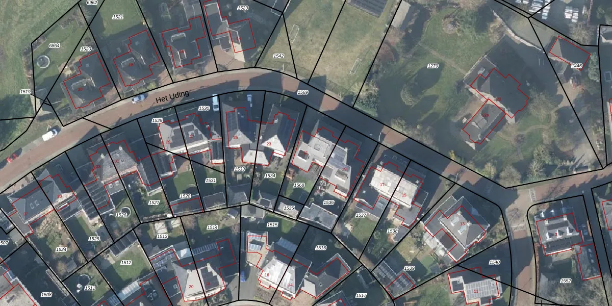 Het perceel waarop Het Uding 21 staat heeft een oppervlakte van 350 m². Dit is een groot perceel. De perceeloppervlakte wordt geregistreerd door het Kadaster. Gedetailleerde informatie over de maten van dit perceel kunt u vinden in het rapport Kadastrale kaart met maatvoering van Het Uding 21.