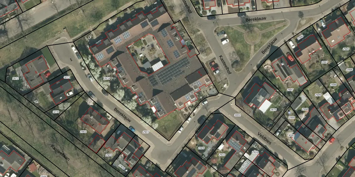 Het perceel waarop Kasteelhof 54 staat heeft een oppervlakte van 3600 m². Dit is een zeer groot perceel. De perceeloppervlakte wordt geregistreerd door het Kadaster. Gedetailleerde informatie over de maten van dit perceel kunt u vinden in het rapport Kadastrale kaart met maatvoering van Kasteelhof 54.