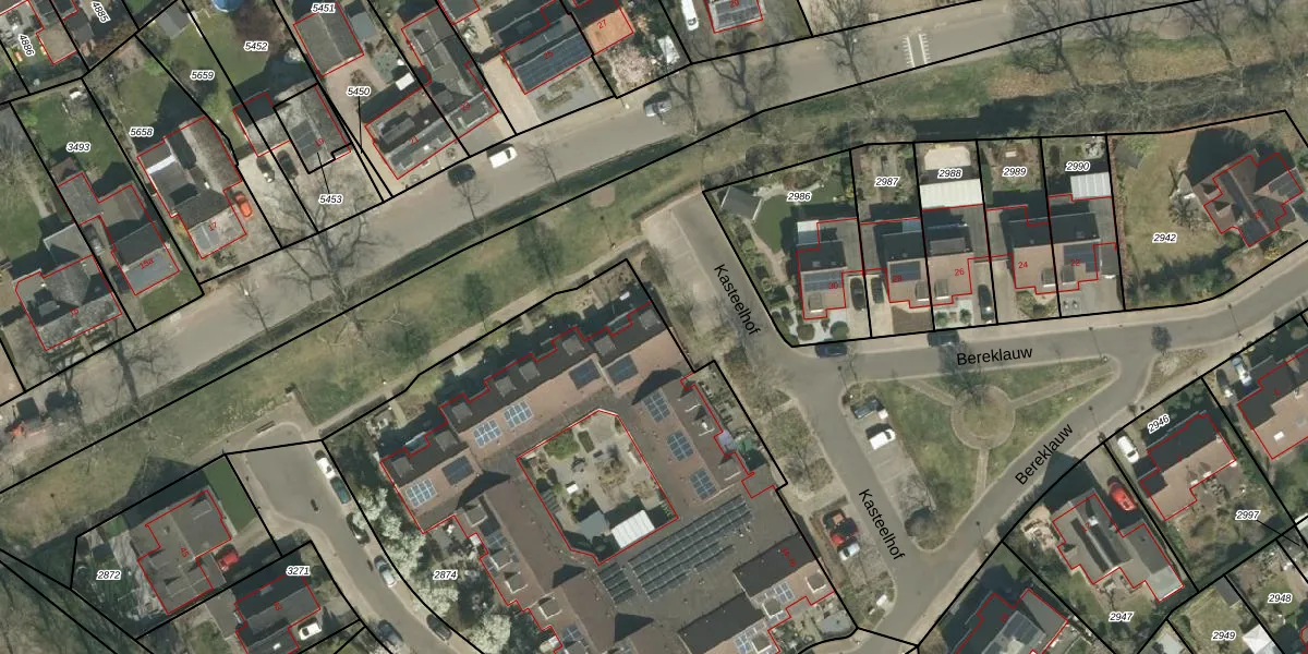 Het perceel waarop Kasteelhof 64 staat heeft een oppervlakte van 3600 m². Dit is een zeer groot perceel. De perceeloppervlakte wordt geregistreerd door het Kadaster. Gedetailleerde informatie over de maten van dit perceel kunt u vinden in het rapport Kadastrale kaart met maatvoering van Kasteelhof 64.
