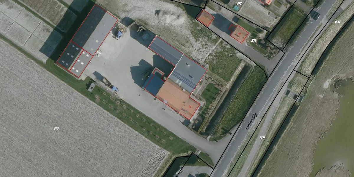 Het perceel waarop Molendijk 73 staat heeft een oppervlakte van 4,1 ha. Dit is een zeer groot perceel. De perceeloppervlakte wordt geregistreerd door het Kadaster. Gedetailleerde informatie over de maten van dit perceel kunt u vinden in het rapport Kadastrale kaart met maatvoering van Molendijk 73.