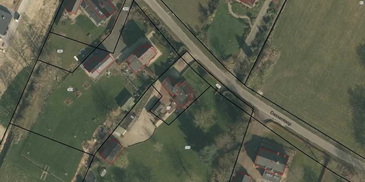 Dassenloop 6 is gelegen op kadastraal perceel BHR02D77. Deze kadastrale aanduiding is uniek en wordt gebruikt door het Kadaster om eigendomsrechten en andere zakelijke rechten vast te leggen. Het perceel maakt onderdeel uit van de kadastrale gemeente Bergharen.