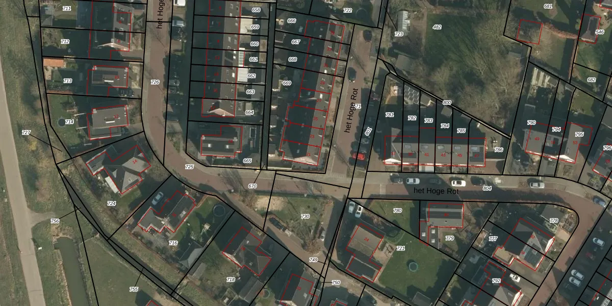 Het perceel waarop het Hoge Rot 21 staat heeft een oppervlakte van 715 m². Dit is een groot perceel. De perceeloppervlakte wordt geregistreerd door het Kadaster. Gedetailleerde informatie over de maten van dit perceel kunt u vinden in het rapport Kadastrale kaart met maatvoering van het Hoge Rot 21.