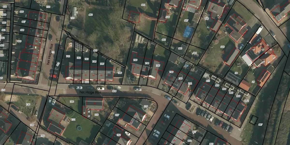 Het perceel waarop het Hoge Rot 51 staat heeft een oppervlakte van 172 m². Dit is een middelgroot perceel. De perceeloppervlakte wordt geregistreerd door het Kadaster. Gedetailleerde informatie over de maten van dit perceel kunt u vinden in het rapport Kadastrale kaart met maatvoering van het Hoge Rot 51.