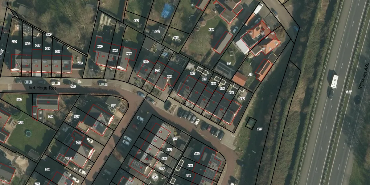 Het perceel waarop het Hoge Rot 61 staat heeft een oppervlakte van 219 m². Dit is een middelgroot perceel. De perceeloppervlakte wordt geregistreerd door het Kadaster. Gedetailleerde informatie over de maten van dit perceel kunt u vinden in het rapport Kadastrale kaart met maatvoering van het Hoge Rot 61.